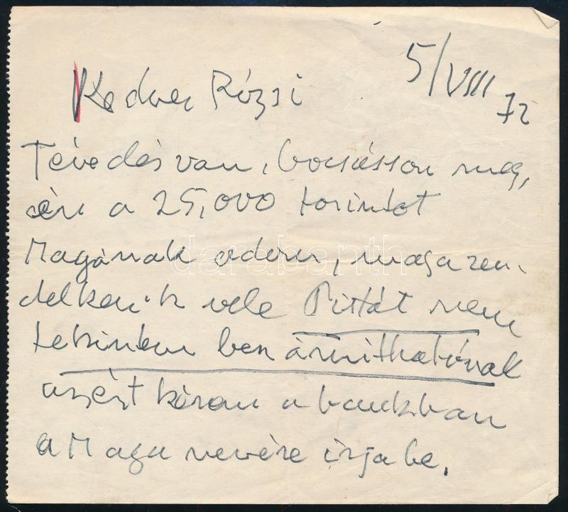 1972 Czóbel Béla festőművész autográf levele, Apáti Abkarovics Rózsi, Apáti Abkarovics Béla (1888-1957) festőművész húgának pénzügyekről. Két kézzel írt oldal, papírlapon, Czóbel Béla festőművész autográf