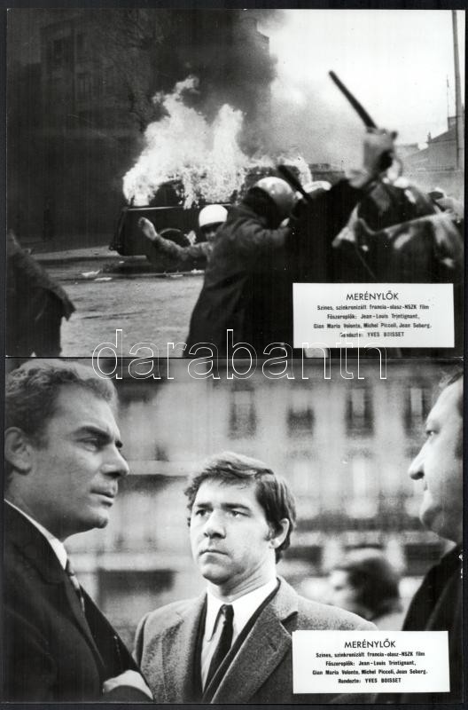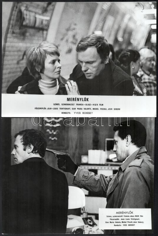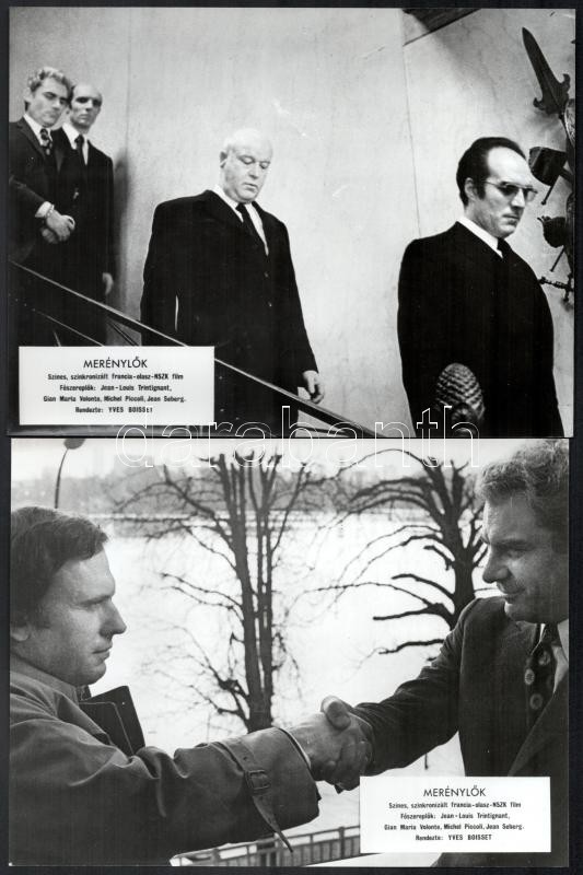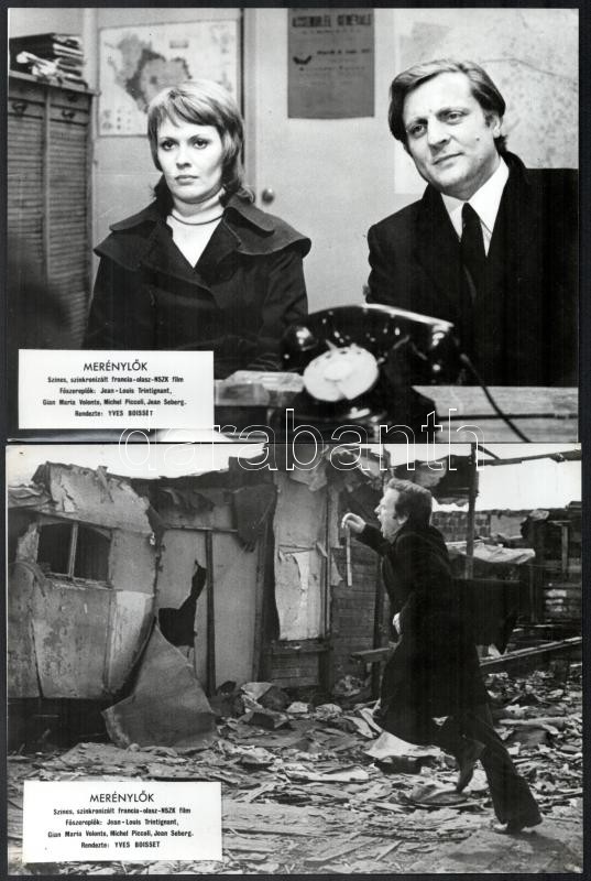 1972 ,,Merénylők’ című francia, olasz, NSZK film jelenetei és szereplői, 13 db vintage produkciós filmfotó, ezüst zselatinos fotópapíron, a képek sarkán gombostű nyoma, 18×24 cm<a href="https://www.darabanth.com/hu/gyorsarveres/417/kategoriak~Fotomu