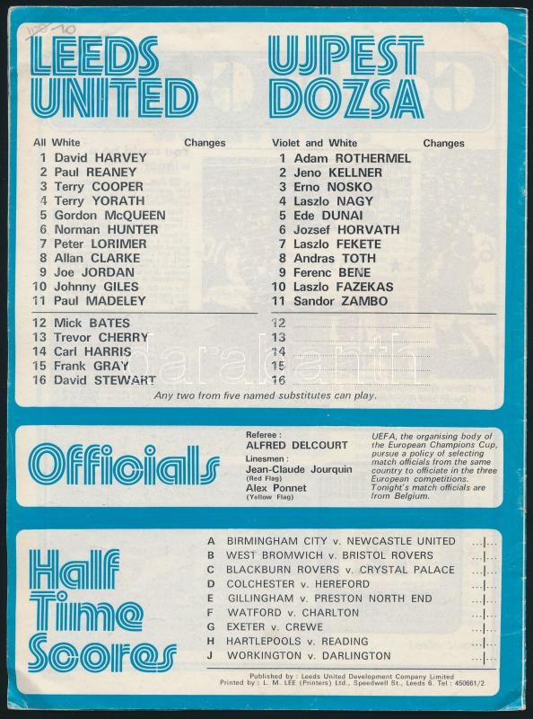 1974 Leeds United – Újpesti Dózsa (2:1) labdarúgó mérkőzés meccsfüzete 12p. / Football match programme<a href="https://www.darabanth.com/hu/gyorsarveres/415/kategoriak~Mutargy-papirregiseg-egyeb/Nyomtatvanyok~1500002/1974-Leeds-United-Ujpesti-Dozsa-