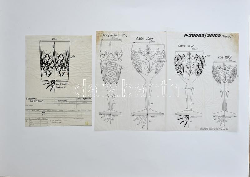1978 Parádi üveggyár. Kristály termékek tervei. 3 db nagy méretű tervrajz, részben nevesítve. Klf tervezőktől. Vázák, kínálók stb. kb 62×44 cm<a href="https://www.darabanth.com/hu/gyorsarveres/410/kategoriak~Mutargy-papirregiseg-egyeb/Tortenelmi-dok