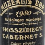 1980 Hosszúhegyi Cabernet Sauvignon 1980, muzeális bor, hajós-bajai borvidék, szakszerűen tárolt bontatlan palack vörösbor, kopott, sérült címkével, 0,75l.