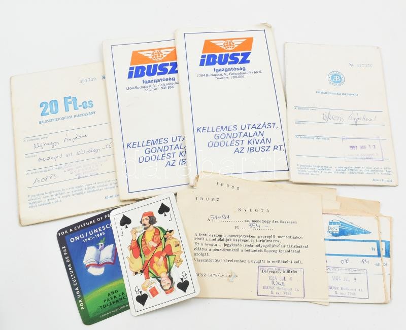 1984-1990 IBUSZ utazási jegyek, balesetbiztosítási igazolvány, 6 db + 2 db kártyanaptár<a href="https://www.darabanth.com/hu/gyorsarveres/424/kategoriak~Mutargy-papirregiseg-egyeb/Okmanyok~500018/1984-1990-IBUSZ-utazasi-jegyek-balesetbiztositasi-iga