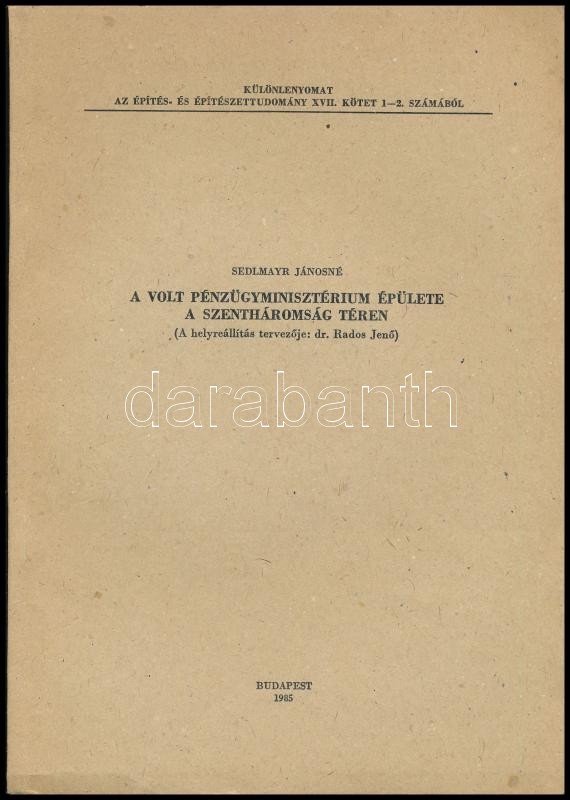 1985 Sedlmayr Jánopsné: A volt Pénzügyminisztérium épülete a Szentháromság téren. A helyreállítás tervezője: dr. Rados Jenő. Különlenyomat az Építés- Építészettudomány XVII. köt. 1-2. számából. Bp., 1985.,