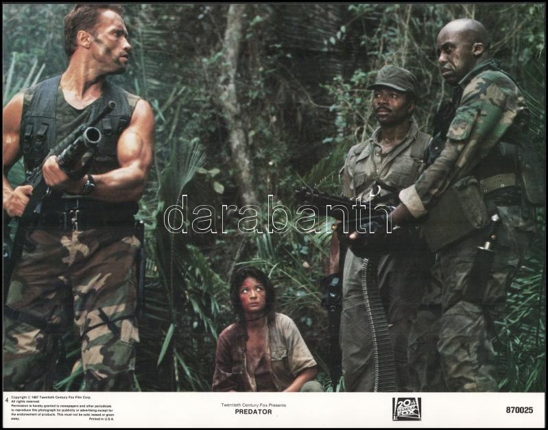 1987 ,,Predator’ című, amerikai filmről 8 db produkciós filmfotó (nyomdai ofszet eljárással készültek kartonlapokra, egyoldalas nyomással), 28×36 cm<a href="https://www.darabanth.com/hu/gyorsarveres/415/kategoriak~Fotomuveszet/Foto~500021/1987-Preda
