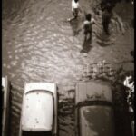 1989 Özönvíz Budán, a XII. kerületi Maros utcában készült 13 db vintage NEGATÍV bemutatja, hogy a nagy mennyiségű esővíz térdig ért a gyalogosoknak, s tengelyig a gépkocsiknak, 24×36 mm
