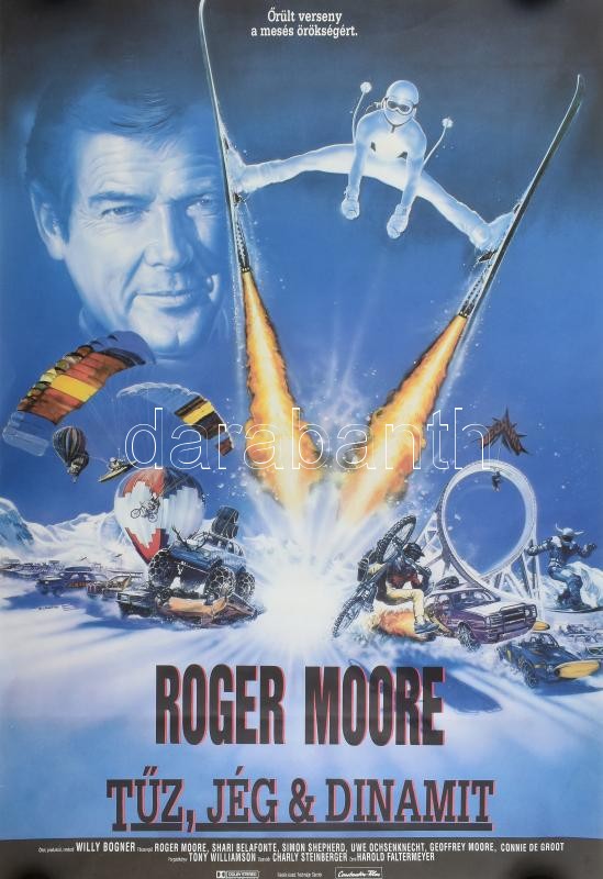 1990 Tűz, jég & dinamit, főszerepben: Roger Moore, nagyméretű filmplakát, moziplakát, hajtásnyommal, feltekerve, 82×56 cm<a href="https://www.darabanth.com/hu/gyorsarveres/416/kategoriak~Konyvek/Plakat~1000003/1990-Tuz-jeg-dinamit-foszerepben-Roger-