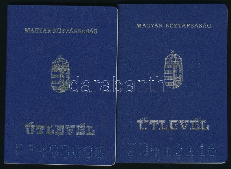 1993, 2004 Magyar Köztársaság által kiállított 2 db eltérő típusú útlevél<a href="https://www.darabanth.com/hu/gyorsarveres/411/kategoriak~Mutargy-papirregiseg-egyeb/Okmanyok~505019/1993-2004-Magyar-Koztarsasag-altal-kiallitott-2-db-eltero-tipusu-ut