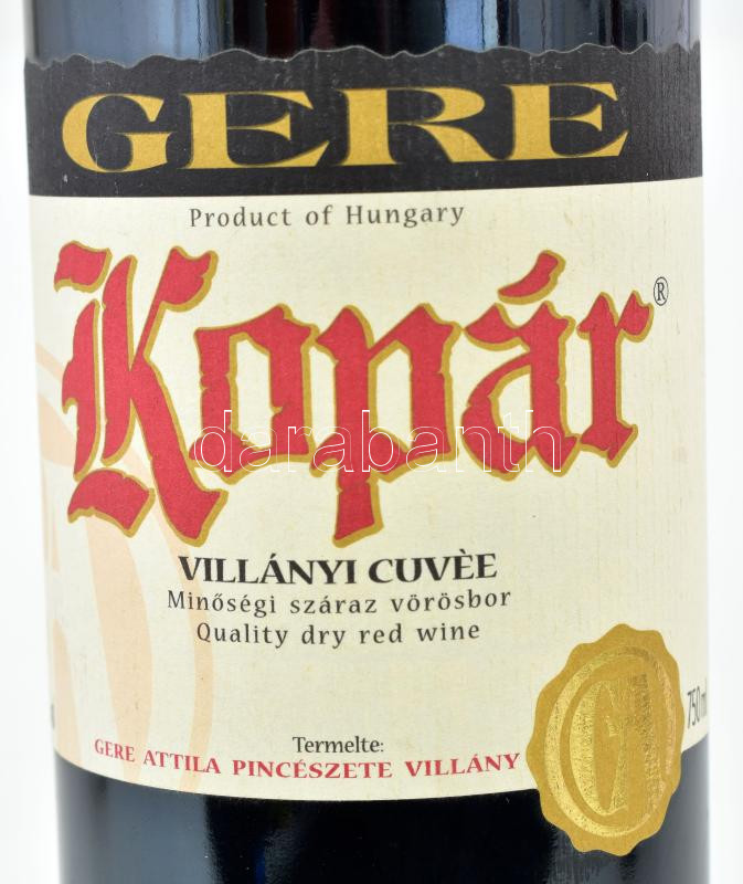 ![1997 Gere Kopár, villányi cuvée, villányi bordeaux-i - stílusú házasítás Cabernet Sauvignon (40%), Merlot (40%), és Cabernet Franc (20%) fajtákból, Gere Attila pincészet ikonikus csúcsborának első évjárata!, bontatlan palack száraz vörösbor, 13%, 0,75 l. "A Kopár születése és jelentősége. A '90-es évek elején Villányban egyre nagyobb figyelem fordult a bordeaux-i fajták, mint a cabernet sauvignon, cabernet franc és merlot irányába. Villány természeti adottságai is arra ösztönözték a helyi borászokat, hogy kísérletezzenek ezekkel a nemzetközi szőlőfajtákkal, hiszen az éghajlat és a talaj minősége ideális feltételeket biztosított számukra. A bordeaux-i házasítások iránti érdeklődés egy maroknyi villányi borászban - köztük Gere Attilában - érett meg igazán, amikor egy franciaországi tanulmányúton, Bordeaux-ban jártak. A nagy hírű chateau-k látogatása, valamint a helyi borok mély nyomot hagytak bennük, és hazatérésük után már egyértelmű volt, hogy elérkezett az idő a magyar borászat egy új fejezetének megírására. 1997-ben megszületett az első Kopar bor, amely már akkor is fantázianévvel indult, jelezve különleges státuszát a Gere Pincészet életében. A bor a legkiválóbb villányi termőterületekről - köztük a legendás Kopár, Konkoly, Csillagvölgy és Ördögárok dűlőkről - származó válogatott termésből készül. A kezdetektől fogva csúcsborunkként tekintünk rá, hiszen a bordeaux-i házasítás művészetének legszebb magyar példájaként szolgá[ljon.] Az első évjárat - 1997: Méltó debütálás: 1997-ben született meg a Gere Pincészet zászlóshajó bora, a Kopar, amely már az induláskor is kiemelkedő minőséget képviselt. Az évjáratot a normál csapadékeloszlás és egy gyönyörű, száraz, meleg ősz tette lehetővé, amely ideális körülményeket biztosított a szőlők érleléséhez. Bár a szüret kissé megkésett, a termésből még mindig tartalmas borokat kóstolnak a villányi vörösboros vidékeken. Az első Kopar házasítása 40% cabernet sauvignonból, 40% merlot-ból és 20% cabernet franc-ból állt, a borok 18 hónapon át érlelődtek 100%-ban új barrique hordókban. A pincészet számára az első teljesen újhordós érlelésű évjárat volt ez, és a tőketerhelés - 10-12 fürt tőkénként - lendületesebb szerkezetet eredményezett. A bor karakterében markánsan jelent meg a tannin, amit a hordófűszerek, a sötét gyümölcsök lekvárja, valamint hűvös ánizsos jegyek egészítettek ki. Illatában aszalt gyümölcsök, mint a szilva és az áfonya dominálnak, míg a kortyban szép savak és gazdag áfonyás ízkarakter érvényesül. A mai napig csodálva kóstoljuk ezt a bort, amely a Gere Pincészet prémium borainak útját kijelölte, és egy sikeres indulást biztosított a Kopar számára. ... "](https://mutargy.com/wp-content/uploads/2025/04/10562.jpg)