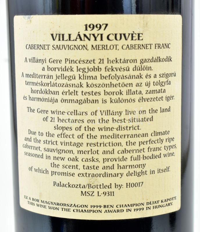 1997 Gere Kopár, villányi cuvée, villányi bordeaux-i – stílusú házasítás Cabernet Sauvignon (40%), Merlot (40%), és Cabernet Franc (20%) fajtákból, Gere Attila pincészet ikonikus csúcsborának első évjárata!, bontatlan palack száraz vörösbor, 13%, 0,75 l. „A Kopár születése és jelentősége. A ’90-es évek elején Villányban egyre nagyobb figyelem fordult a bordeaux-i fajták, mint a cabernet sauvignon, cabernet franc és merlot irányába. Villány természeti adottságai is arra ösztönözték a helyi borászokat, hogy kísérletezzenek ezekkel a nemzetközi szőlőfajtákkal, hiszen az éghajlat és a talaj minősége ideális feltételeket biztosított számukra. A bordeaux-i házasítások iránti érdeklődés egy maroknyi villányi borászban – köztük Gere Attilában – érett meg igazán, amikor egy franciaországi tanulmányúton, Bordeaux-ban jártak. A nagy hírű chateau-k látogatása, valamint a helyi borok mély nyomot hagytak bennük, és hazatérésük után már egyértelmű volt, hogy elérkezett az idő a magyar borászat egy új fejezetének megírására. 1997-ben megszületett az első Kopar bor, amely már akkor is fantázianévvel indult, jelezve különleges státuszát a Gere Pincészet életében. A bor a legkiválóbb villányi termőterületekről – köztük a legendás Kopár, Konkoly, Csillagvölgy és Ördögárok dűlőkről – származó válogatott termésből készül. A kezdetektől fogva csúcsborunkként tekintünk rá, hiszen a bordeaux-i házasítás művészetének legszebb magyar példájaként szolgá[ljon.] Az első évjárat – 1997: Méltó debütálás: 1997-ben született meg a Gere Pincészet zászlóshajó bora, a Kopar, amely már az induláskor is kiemelkedő minőséget képviselt. Az évjáratot a normál csapadékeloszlás és egy gyönyörű, száraz, meleg ősz tette lehetővé, amely ideális körülményeket biztosított a szőlők érleléséhez. Bár a szüret kissé megkésett, a termésből még mindig tartalmas borokat kóstolnak a villányi vörösboros vidékeken. Az első Kopar házasítása 40% cabernet sauvignonból, 40% merlot-ból és 20% cabernet franc-ból állt, a borok 18 hónapon át érlelődtek 100%-ban új barrique hordókban. A pincészet számára az első teljesen újhordós érlelésű évjárat volt ez, és a tőketerhelés – 10-12 fürt tőkénként – lendületesebb szerkezetet eredményezett. A bor karakterében markánsan jelent meg a tannin, amit a hordófűszerek, a sötét gyümölcsök lekvárja, valamint hűvös ánizsos jegyek egészítettek ki. Illatában aszalt gyümölcsök, mint a szilva és az áfonya dominálnak, míg a kortyban szép savak és gazdag áfonyás ízkarakter érvényesül. A mai napig csodálva kóstoljuk ezt a bort, amely a Gere Pincészet prémium borainak útját kijelölte, és egy sikeres indulást biztosított a Kopar számára. … „