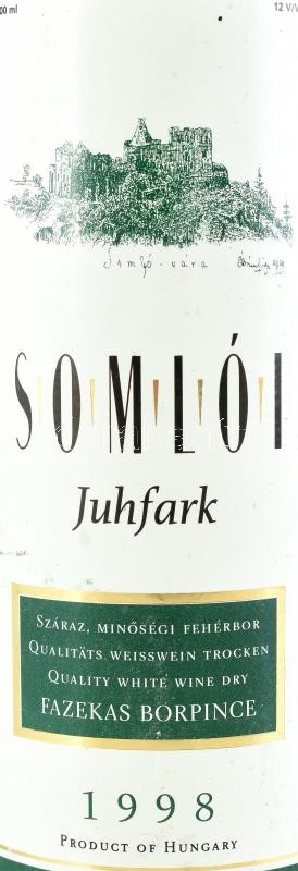 1998 Fazekas Borpince Somlói Juhfark, szakszerűen tárolt, bontatlan palack száraz fehérbor, abv: 12%, 0,5l.