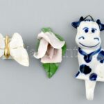 3 db kis porcelán figura (Aquincumi rózsa, pillangó, boci akasztóval). Kézzel festettek, az egyik jelzett, kis kopással.