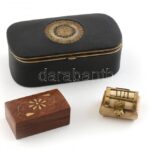 3 db különféle doboz (műbőr borítású tükrös doboz, réz berakásos fa ékszeres dobozka, csont és réz ékszeres dobozka), 19x10x7 cm és 6×4,5×4 cm között<a href="https://www.darabanth.com/hu/gyorsarveres/415/kategoriak~Mutargy-papirregiseg-egyeb/Bolhapi