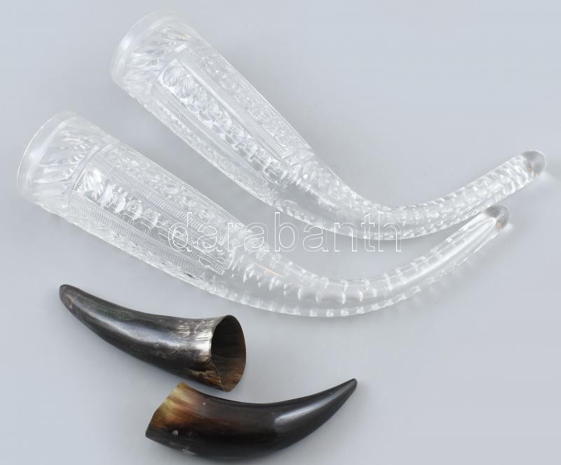 4 db ivókürt: 2 db nagyméretű, díszes csiszolt üveg, h: 24-26 cm + 2 db kisebb szaru, h: 11-12 cm