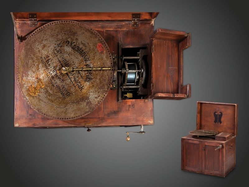 404. tétel, Zenedoboz Nagyméretű hordozható Euphonion, 17 db. 50cm-es (19,5 coll) eredeti acéllemezzel. Működőképes. Német, 1900 körül. Feltehetően 1920-30 körül készült utólagos dobozán készítői jelzés: Balla Tibor Rádió villanyszerelési és mechanik