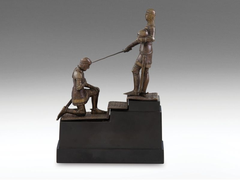 409. tétel, T. Curtis jelzéssel Jeanne d’Arc lovaggá ütése Öntött, patinázott bronz, fekete márvány talpon. Talapzat csorbult. Bronz talapzaton jelzett: kurzív T Curtis. Ausztria, XX. sz. eleje. M.: 20 × 8 × 29 cm
