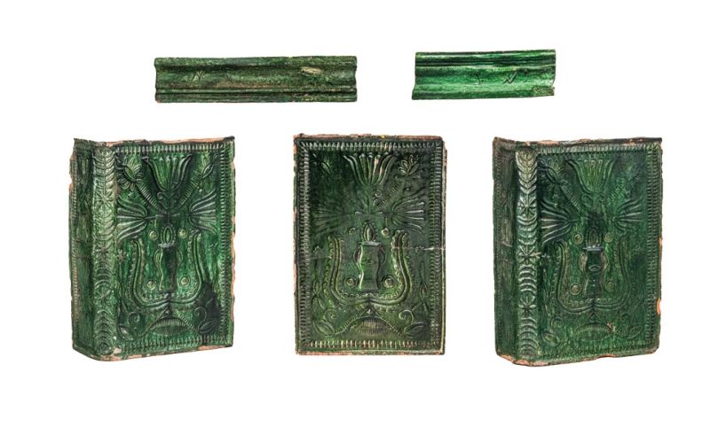 442. tétel, Peremdísz 2 db, sarokcsempe 2 db és kályhacsempe