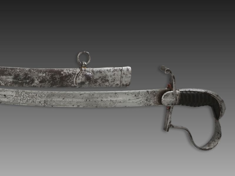 Kikiáltási ár: 130 000 FtSárgaréz markolatkosár és keresztvas. Huzalozott vörösréz markolat borítással, vésett acél pengével. Hüvely nélkül. Francia, 1830 körül. H.: 101 cm