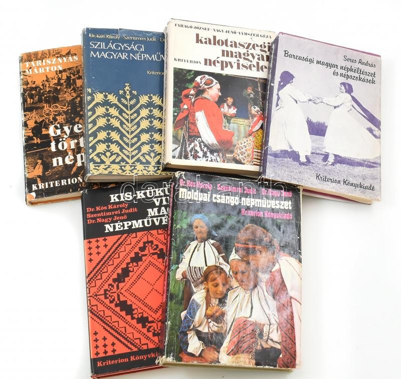 6 db erdélyi népművészet, néprajz témájú könyv: Kós Károly-Szentimrei Judit-Nagy Jenő: Szilágysági magyar népművészet; Tarisznyás Márton: Gyergyó történeti néprajza; Faragó József-Nagy Jenő-Vámszer Géza: Kalotaszegi magyar népviselet; Seres András: Barcas