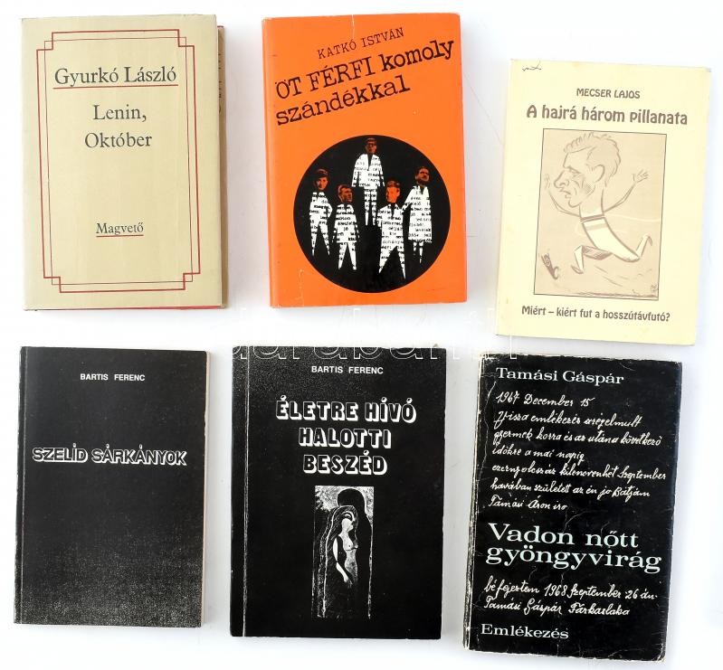 6 db könyv – Vadon nőtt gyöngyvirág; Életre hívó halotti beszéd; Szelíd sárkányok; Lenin, október; Öt férfi komoly szándékkal, A hajrá három pillanata. Kötetenként változó kötésben és állapotban.