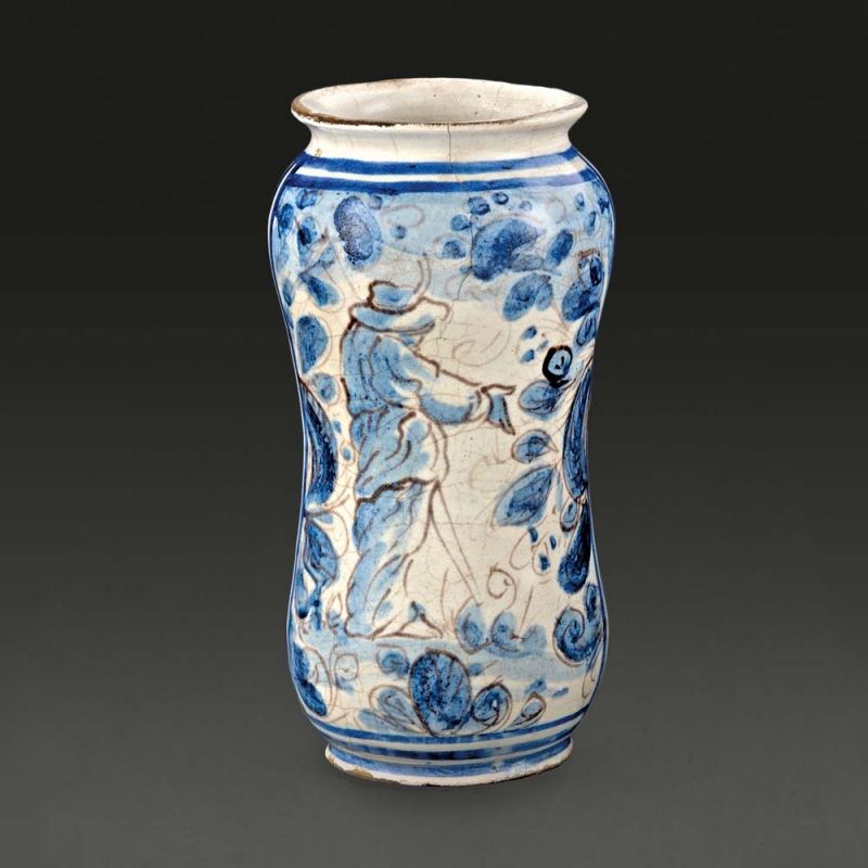 Műtárgy leírás – Itália, 1711, ónmázas fajansz, hajszálrepedéssel, m: 21,5 cm