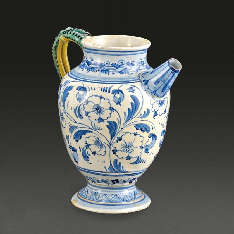 Műtárgy leírás – Itália, 19. sz., ónmázas fajansz, kígyó formájú füllel, jelezve az alján, m: 23,5 cm