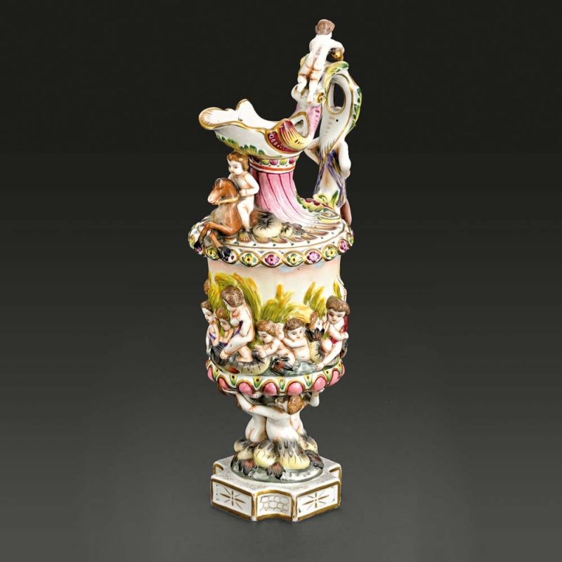 Műtárgy leírás – Capodimonte, 19. sz. vége, festett porcelán, figurális díszítéssel, jelzett az alján, m: 28 cm