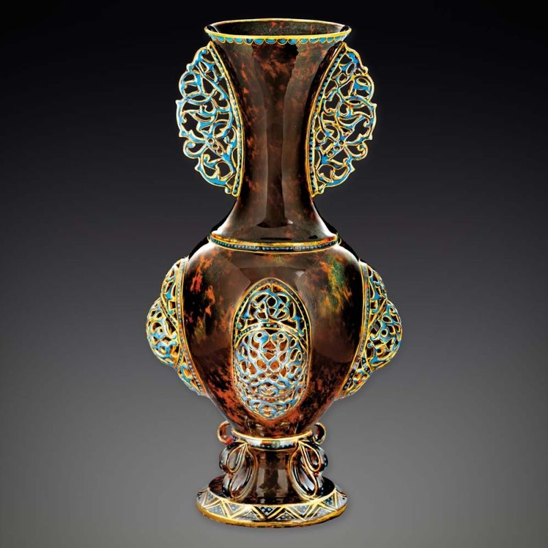 Műtárgy leírás – Fischer Ignác, Budapest, 1890 körül, festett, aranyozott fehércserép, áttört díszítéssel, jelezve az alján: masszába nyomott "Fischer I. Budapest", formaszám: 877, m: 38,5 cm