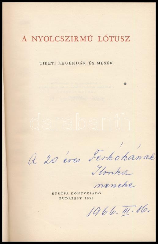 A nyolcszirmú lótusz. Tibeti legendák és mesék. Bp., 1958, Európa. Kiadói félvászon kötés, papír védőborítóval, jó állapotban, ajándékozási sorokkal.<a href="https://www.darabanth.com/hu/gyorsarveres/411/kategoriak~Konyvek/Konyvek-Mesekonyvek-ifjusa