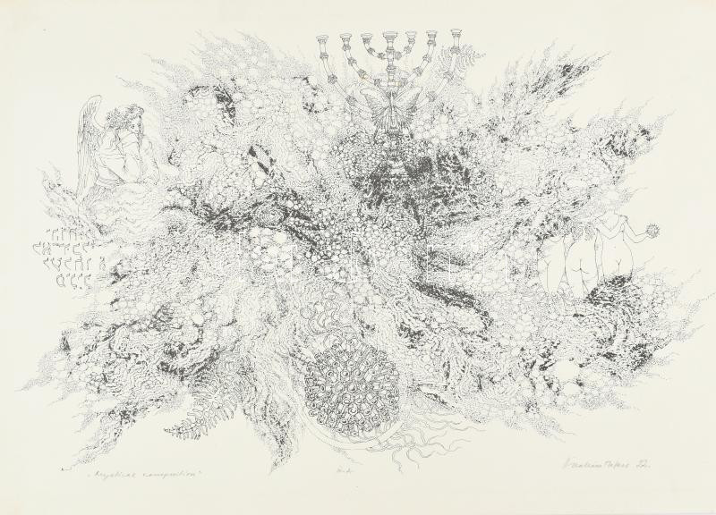 Ábrahám Rafael (1929-2014): Mystical composition. Szitanyomat, papír, jelzett, művészpéldány E.A. jelzéssel, 35×54 cm<a href="https://www.darabanth.com/hu/gyorsarveres/436/kategoriak~Festmenyek-es-grafikak/Festmenyek-es-grafikak~500001/Abraham-Rafae