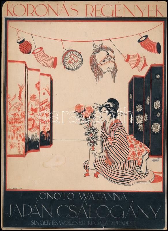 Ada Dezső 1921: Japán csalogány c. könyv borítójának terve. Vegyes technika, karton. Jelzett 30×22 cm<a href="https://www.darabanth.com/hu/gyorsarveres/427/kategoriak~Festmenyek-es-grafikak/Festmenyek-es-grafikak~500001/Ada-Dezso-1921-Japan-csalogan