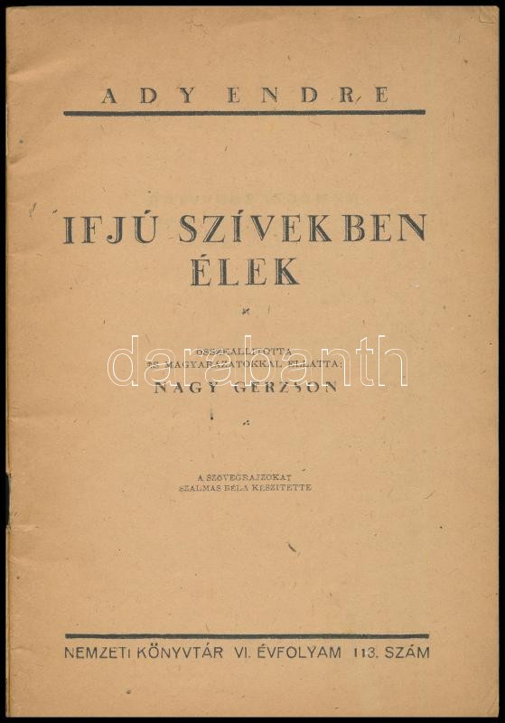 Ady Endre: Ifjú szívekben élek. Összeállította és magyarázatokkal ellátta: Nagy Gerzson. Nemzeti Könyvtár 113. szám. Bp., 1944, Nemzeti Könyvtár. Kiadói papírkötés, kopott borítóval, a hátsó borítón ceruzás firkával, tollas jegyzettel.<a href="https