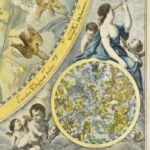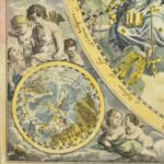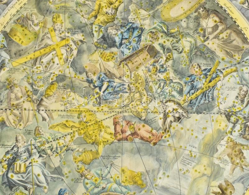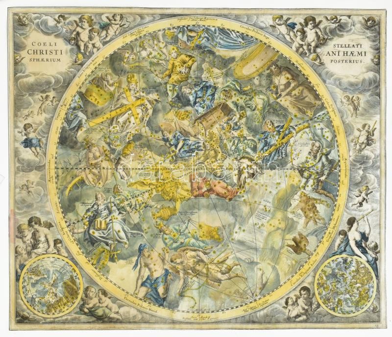 Andreas Cellarius (1596-1665) Coeli Stellati Christiani Haemisphaerium Posterius. – A keresztény égbolt csillagtérjépe Színezett rézmetszetű éggömb térkép, csillagtérkép. Megjelent Atlas Coelestis seu Harmonia Macrocosmica Amsterdam, 1708. Restaurált, kör