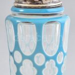 Antik, 2 db XIX. sz. fűszertartó üveg edény ezüst (Ag) tetővel, jelzés nélkül és egy ezüst kanállal, jelzett. Üveg edények m: 13 cm. Üvegek alsó részén sérülésekkel, és ezüst tetők elváltak a zsanéroktól.