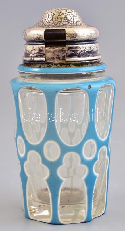 Antik, 2 db XIX. sz. fűszertartó üveg edény ezüst (Ag) tetővel, jelzés nélkül és egy ezüst kanállal, jelzett. Üveg edények m: 13 cm. Üvegek alsó részén sérülésekkel, és ezüst tetők elváltak a zsanéroktól.<a href="https://www.darabanth.com/hu/gyorsar