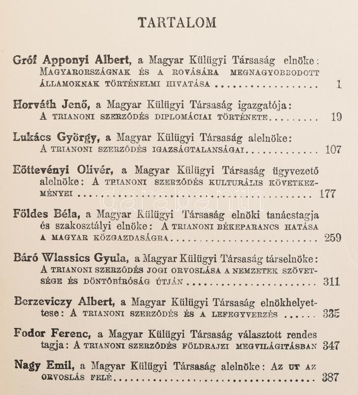 Apponyi Albert et al.: Igazságot Magyarországnak. A trianoni békeszerződés következményeinek ismertetése és bírálata. Bp., 1928, Magyar Külügyi Társaság,(Budapesti Hírlap-ny.), 8+402 p.+ 1 t. (térkép-mellékletek: Magyarország