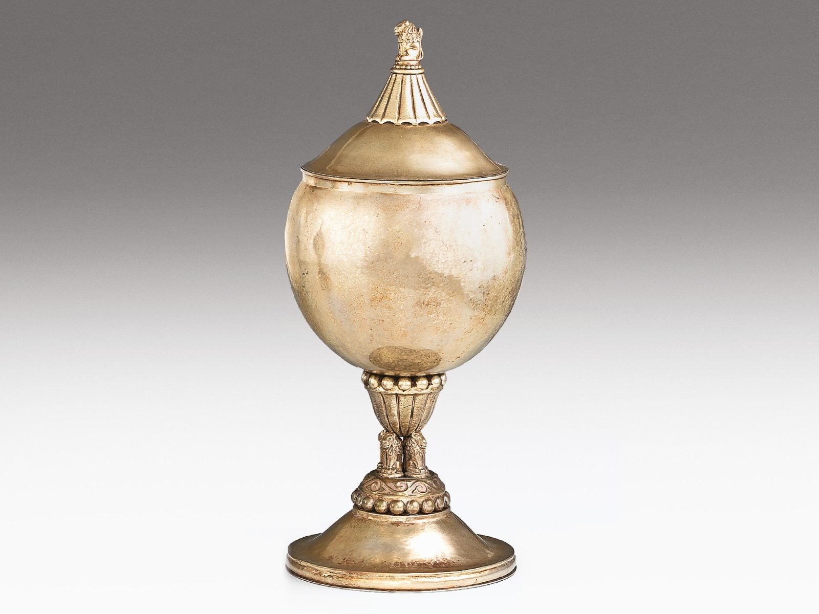 Art deco fedeles serleg Ezüstözött, domborított és matlézott vörösréz. Kerek talpon golyókkal keretezett art deco szár négy oroszlánnal, rajta gömb formájú kehely. Leemelhető fedelén cizellált és vésett oroszlán fogó. Dekorterv és kivitel: Kiss Ferenc.