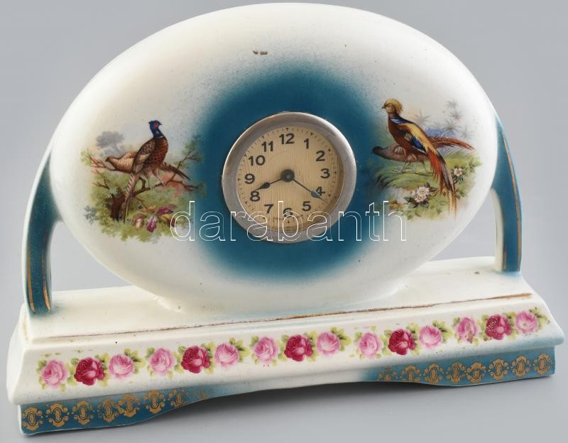 Asztali fajansz óra, mechanikus szerkezettel, működik, jelzett, kopott, 31x8x22cm