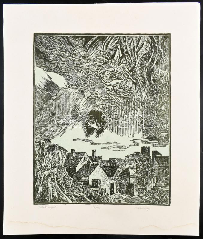 Badacsonyi Sándor (1949-2016): Bukott angyal. Linómetszet, papír, jelzett. Számozott: 75/100. Lap alja foltos. 34,5×27,5 cm<a href="https://www.darabanth.com/hu/gyorsarveres/429/kategoriak~Festmenyek-es-grafikak/Festmenyek-es-grafikak~500001/Badacso