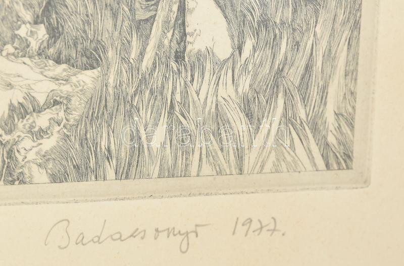 Badacsonyi Sándor (1949-2016): Vadászat, rézkarc, papír, jelzett, számozott (75/100), üvegezett keretben, 29,5×29,5 cm<a href="https://www.darabanth.com/hu/gyorsarveres/433/kategoriak~Festmenyek-es-grafikak/Festmenyek-es-grafikak~500001/Badacsonyi-S