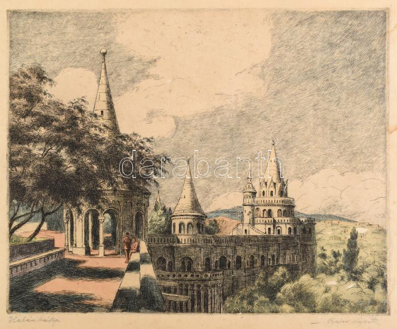 Bajor Ágost (1892-1958): Halászbástya. Színezett rézkarc, papír, jelzett, foltos, lap széle vágott, 24×29,5 cm<a href="https://www.darabanth.com/hu/gyorsarveres/437/kategoriak~Festmenyek-es-grafikak/Festmenyek-es-grafikak~500001/Bajor-Agost-1892-195