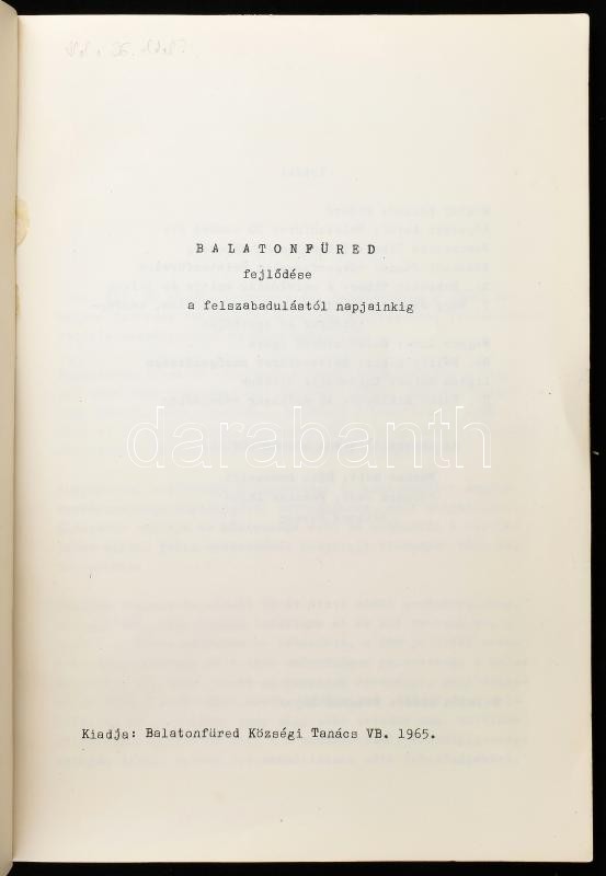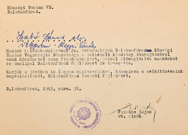 Balatonfüred fejlődése a felszabadulástól napjainkig. Balatonfüred, 1965., Balatonfüred Községi Tanács V.B. Kiadói papírkötés. Megjelent 250 példányban. Balatonfüredi Községi Tanács VB ajándékozási papírjával, rajta