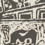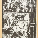 Bálint Endre (1914-1986): ‘Kurva kávézó’. Linómetszet, papír, jelzett, Bálint Endre autográf ajándékozási soraival (paszpartu által takarva), 32,5×20 cm, üvegezett fakeretben.