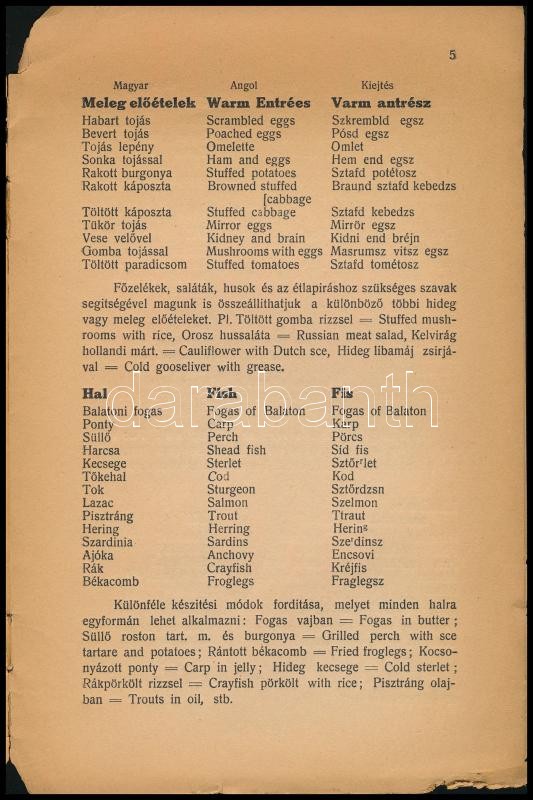 Ballner Károly: Magyar-angol gasztronomia dióhéjban. 300 angol szó pincérek számára a kiejtés megjelölésével. H.n., 1937, szerzői. 16p. Kiadói papírborítóban, sérült lapokkal és borítóval.