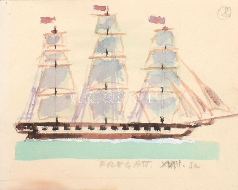 Bánki Endre (Hajógéptan írója): Hajótípusok. Akvarell papír, 12db összetűzve, ritka. 7x9cm. Jelzett.<a href="https://www.darabanth.com/hu/gyorsarveres/431/kategoriak~Festmenyek-es-grafikak/Festmenyek-es-grafikak~5000002/Banki-Endre-Hajogeptan-iroja-