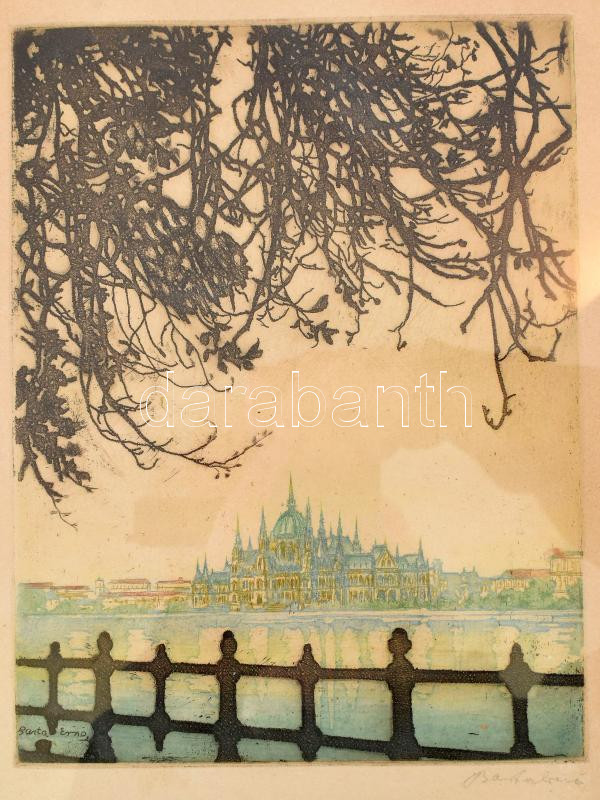 Barta Ernő (1878-1956): Budapesti Dunapart, háttérben a Parlament. Színezett rézkarc, papír, jelzett. Üvegezett fakeretben, 22,5×17 cm<a href="https://www.darabanth.com/hu/gyorsarveres/433/kategoriak~Festmenyek-es-grafikak/Festmenyek-es-grafikak~500