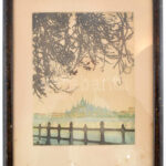Barta Ernő (1878-1956): Budapesti Dunapart, háttérben a Parlament. Színezett rézkarc, papír, jelzett. Üvegezett fakeretben, 22,5×17 cm