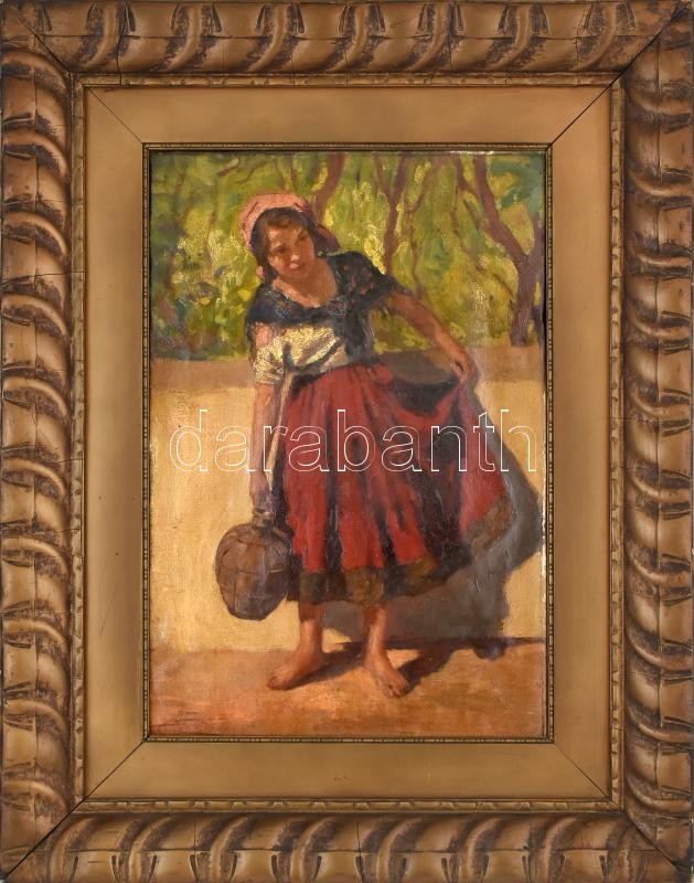 Béli Vörös Ernő (1882-1922): Lány korsóval. Olaj, vászon. Jelezve balra lent. 53x35cm. Korabeli, dekoratív, kissé sérült fakeretben / oil on canvas, signed, framed<a href="https://www.darabanth.com/hu/gyorsarveres/437/kategoriak~Festmenyek-es-grafik