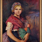 Bendéné Kovacsev Friderika (1891-1975): Kislány babával. Olaj, vászon, jelezve jobbra lent. 60×50 cm. Dekoratív fakeretben.
