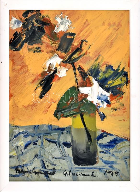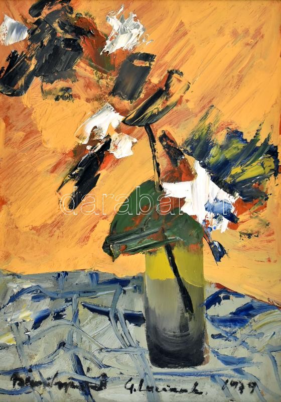Bényi Árpád (1931-2006): Virágcsendélet. Olaj, karton, jelzett, autográf ajánlási sorokkal, fa keretben. 40×30 cm<a href="https://www.darabanth.com/hu/gyorsarveres/414/kategoriak~Festmenyek-es-grafikak/Festmenyek-es-grafikak~500001/Benyi-Arpad-1931-