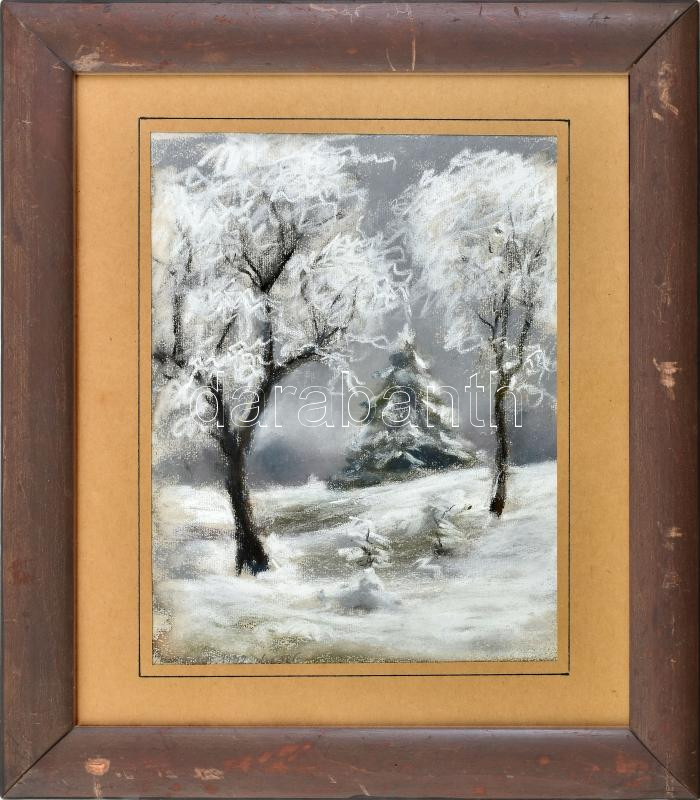 Bertalan Rózsa (1900-1987): Téli táj, 1930-as évek. Pasztell, papír, jelzés nélkül, balra lent autográf felirattal és datálással, 28×21,5 cm, üvegezett fakeretben, sérült üveggel.<a href="https://www.darabanth.com/hu/gyorsarveres/437/kategoriak~Fest